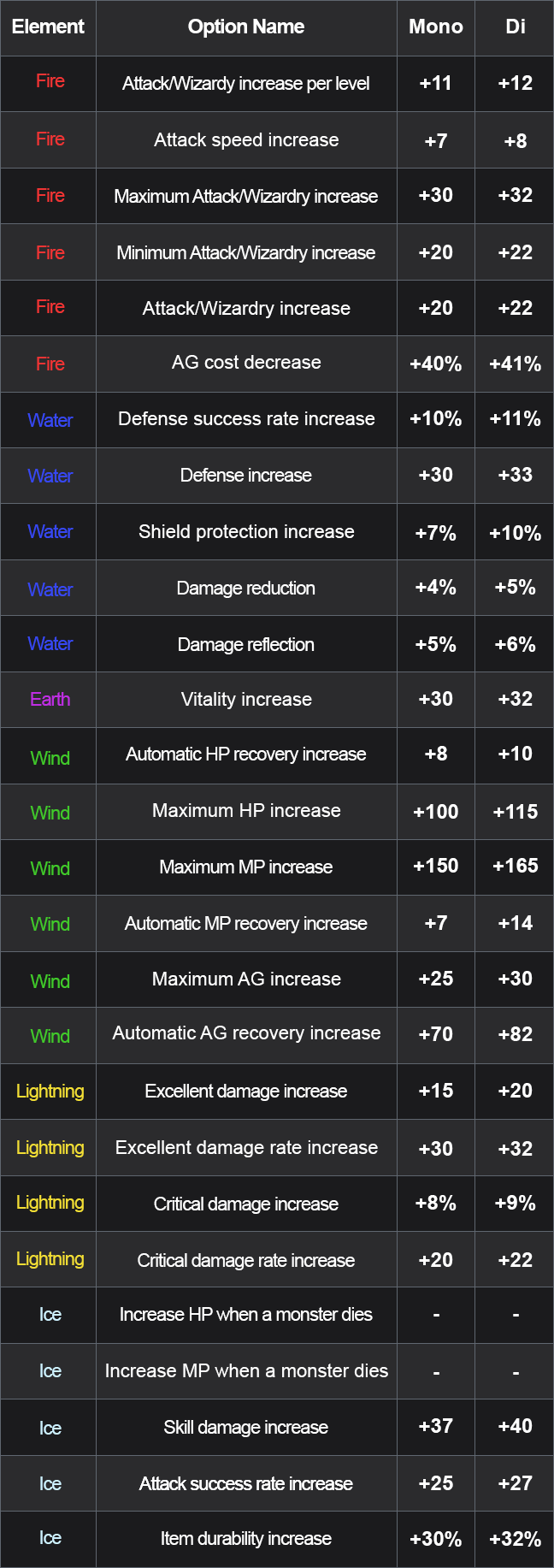 | SLOT1: Fire SLOT2: Lightning SLOT3: Ice Attack power increase +11SLOT1: Lightning SLOT2: Ice SLOT3: Fire Skill attack increase +11 | SLOT1: Fire SLOT2: Lightning SLOT3: Ice Attack/Wizardry increase +5SLOT1: Lightning SLOT2: Ice SLOT3: Fire Skill attack increase +11 | SLOT1: Water SLOT2: Earth SLOT3: Wind Defense increase +24SLOT1: Earth SLOT2: Wind SLOT3: Water Maximum HP increase +29 |