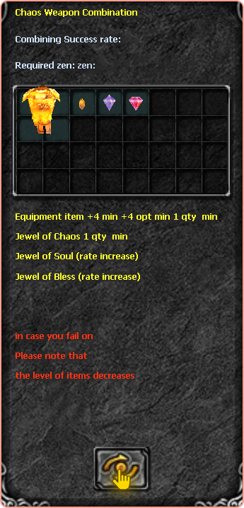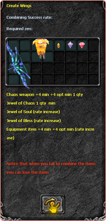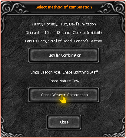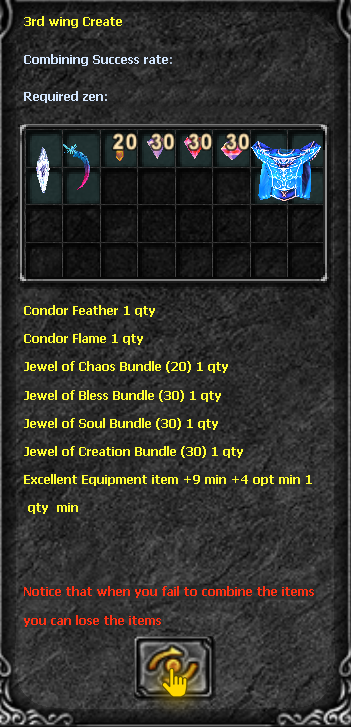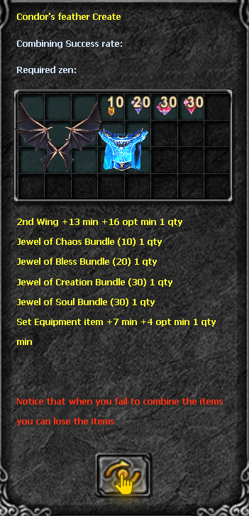 Trong trường hợp sử dụng Huy Hiệu Chaos Tổ Hợp, Wings và Trang bị Cổ Điển sẽ được giữ lại, nhưng trả về cấp độ +0, nếu không, tất cả các mặt hàng sẽ bị tiêu thụ mà không có ngoại lệ.