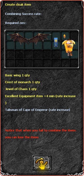 Bạn sẽ nhận được một Wings +0 hoặc Cape +0 (sử dụng Crest of Monarch) với một tùy chọn ngẫu nhiên hoặc thậm chí không có tùy chọn.