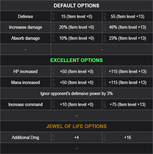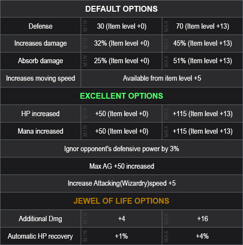Dưới đây là danh sách các tùy chọn bổ sung cho mỗi Wings và giá trị của chúng cho từng cấp độ mặt hàng từ +0 đến +13.