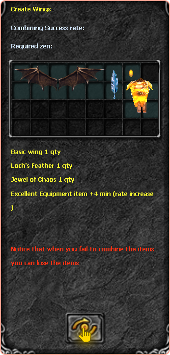 Trong trường hợp sử dụng Huy Hiệu Chaos Tổ Hợp, Wings và Trang bị Cổ Điển sẽ được giữ lại, nhưng trả về cấp độ +0, nếu không, tất cả các mặt hàng sẽ bị tiêu thụ mà không có ngoại lệ.